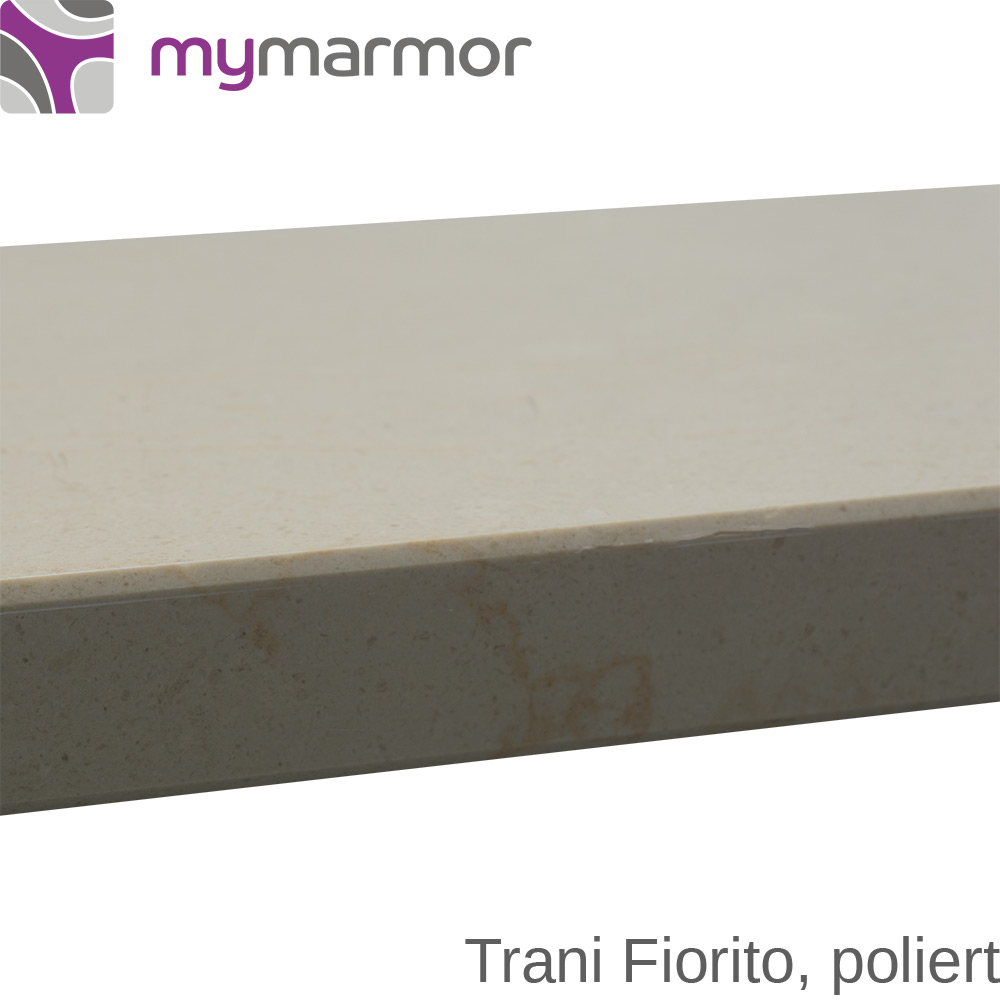 Der weiche Kalkstein ist gut formbar und daher individuell an Ihre Wünsche anpassbar. Der Marmor Trani Fiorito kann ganz einfach bei mymarmor online konfiguriert werden und nach Sonderwünschen auf Maß zugeschnitten werden. Die luxuriösen Natursteinplatten können zum Beispiel mit runden oder eckigen Ausklinkungen geliefert werden und sind damit perfekt geeignet für Waschtische oder Küchenplatten.